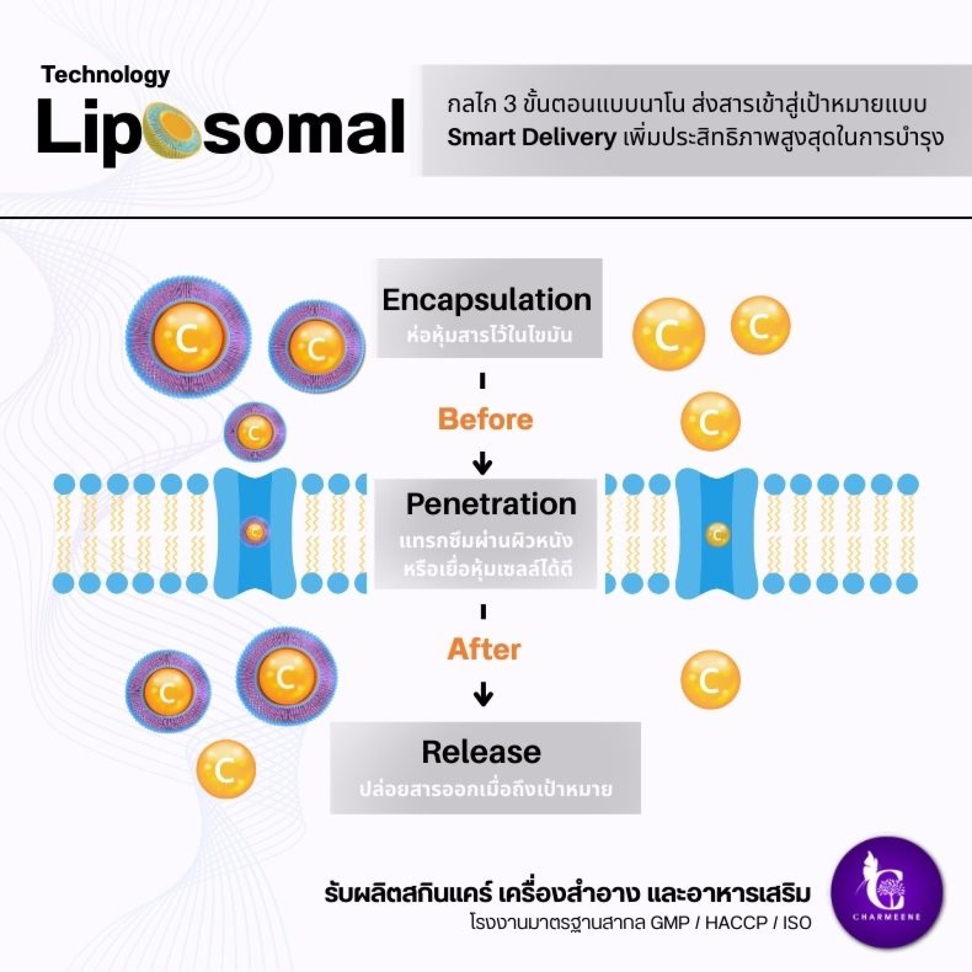 Encapsulation : สารสำคัญถูกห่อหุ้มไว้ภายในโครงสร้างไขมัน เพื่อป้องกันการสลายตัวก่อนเวลาอันควร